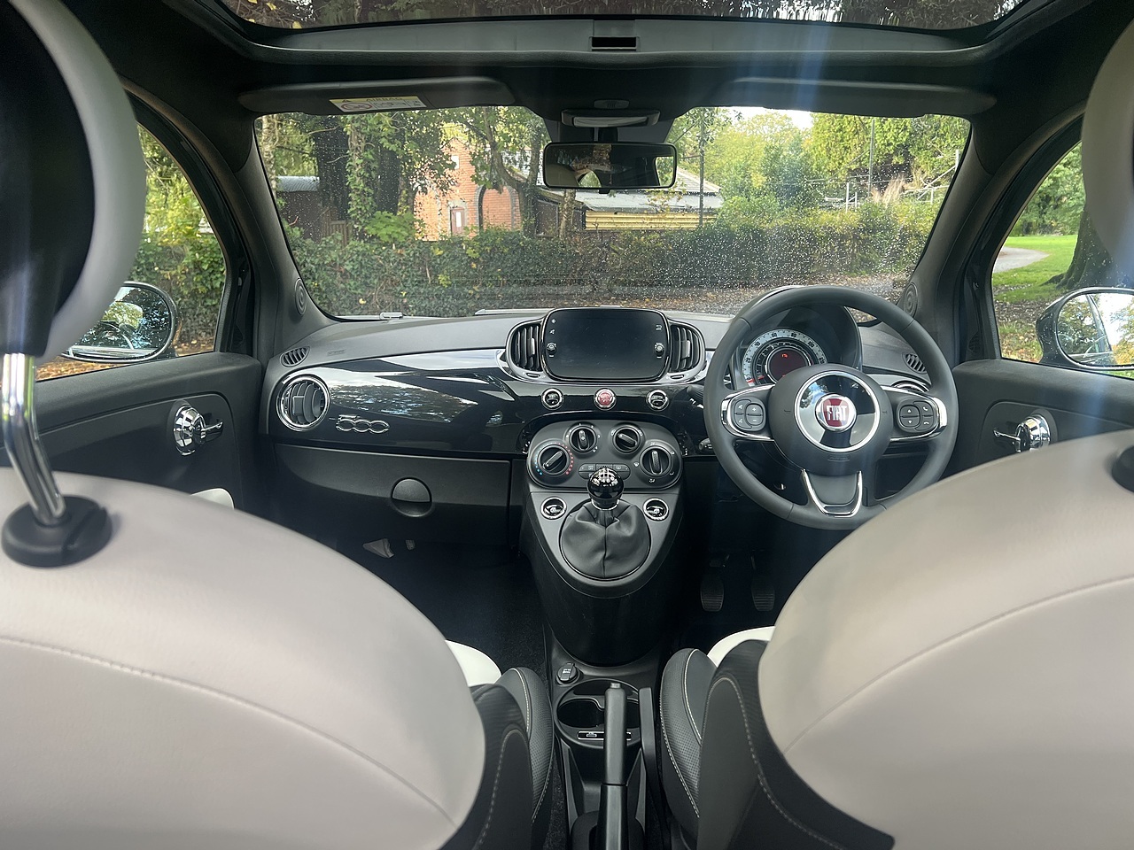 Apple car play/Android Auto, Cruise Control, Ecall, External temperature gauge, Power assist steering, Rear parking sensor, Speed limiter, Stop/start system, Trip computer, 4 speakers, 7" HD Touchscreen Radio, Bluetooth, USB and DAB, Rear speakers, 3rd brake light, Auto headlights, Body colour bumpers, Body coloured electrically adjustable door mirrors, Chrome plated exterior door handles, Dolcevita badge on fender, Dusk and rain sensors, Electric front windows, Fixed glass sunroof with sunblind, Front fog lights, Halogen headlamps, Heat insulated glass, Heated rear windows with wash wipe, LED daytime running lights, Rear side wing doors, Rear wiper, 1 passenger grab handle, 2 seat bench in second row, 50/50 split folding rear seats with height adjustable rear headrests, Air Conditioning, Auxilliary 12V power socket, Chrome kit, Front Headrests, Height adjustable drivers seat, Height adjustable steering wheel, ISOFIX child seat preparation, Single front passenger seat, Techno leather steering wheel with audio controls, 7 airbags Driver, passenger, side, window and drivers knee airbags, ABS/EBD, ESC + ASR/MSR + HBA + Hill holder, Passenger airbag deactivation system, Traction Control, Tyre pressure monitoring system, Automatic door locking, Immobiliser, Locking fuel filler cap, Remote Central Locking, 15" Alloy wheels.